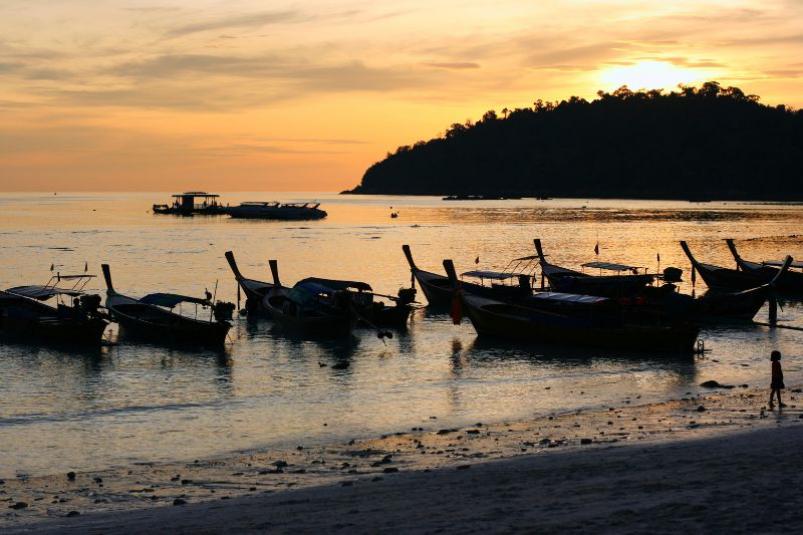 When people talk about the most beautiful time of day on Phi Phi Islands, many picture a glowing orange sun slowly sinking into the horizon — the sky melting from gold to soft pink and coral hues, reflecting across the crystal-clear sea.